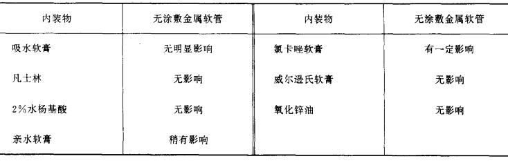 某些内装物会与铝产生化学反应而使产品变质,铝软管也受到侵蚀,所以在铝软管内部有时需涂敷涂料。各种内装物对于没有涂敷的金属软管的影响见表5-63。